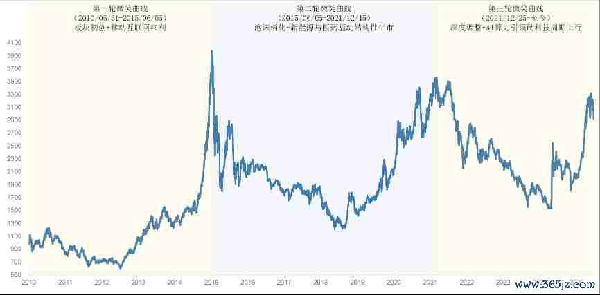 图:2010-2025年创业板指的三轮“含笑弧线”
